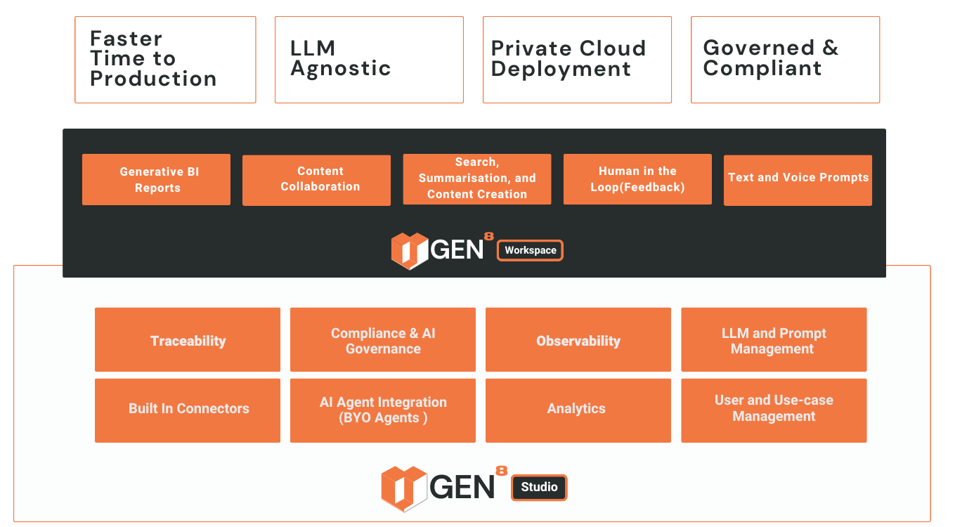 Using the GEN8 Accelerator Framework, we rapidly define, validate, and deploy high-impact generative AI use cases. Our structured approach reduces experimentation time while ensuring solutions are business-aligned and production-ready.​